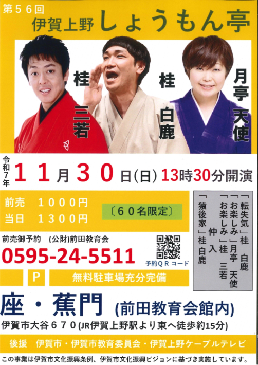 【出演】桂 三若、月亭 天使、桂 白鹿 【定員】60名 【料金】前売り1,000円、当日1,300円 【チケット】前売り予約・販売(公財)前田教育会 または、WEB予約 ※WEB予約はこちらから 【お問合せ】 (公財)前田教育会 ℡0595-24-5511 (月曜休館、午前9時~午後5時)