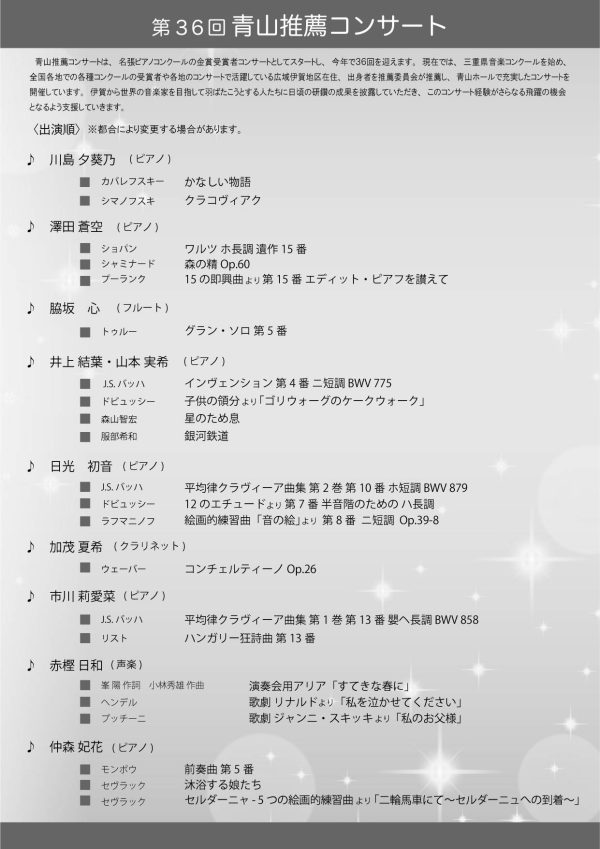 三重県音楽コンクールを始め、全国各地での各種コンクールの受賞者や各地のコンサートで活躍している広域伊賀地区在住、出身者を推薦委員会が推薦し、青山ホールで充実したコンサートを開催しています。伊賀から世界の音楽家を目指して羽ばたこうとする人たちに日頃の研鑽の成果を披露していただき、このコンサート経験がさらなる飛躍の機会となるように支援しています。