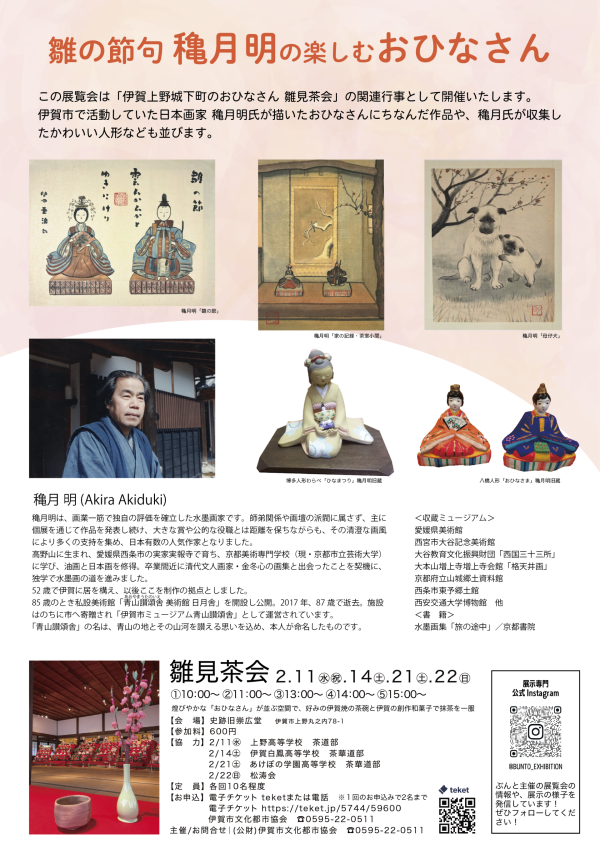 伊賀市で活動していた日本画家 穐月明氏が描いたおひなさんにちなんだ作品や、穐月氏が収集したかわいい人形などが並びます。