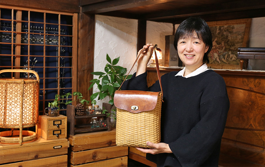 まだまだやりたいことがたくさんあるという岡さん。その中の一つが、竹細工だ。一昨年の冬から試作用の材料の準備を始め、昨年からは大阪の竹細工の教室に通い始めた。材料は工房の近くに生えている竹を使う。まず、竹林から竹を切り出し、火であぶって油抜きをし、長期間乾燥させる。さらに、その竹を細く割り竹ひごをつくるという、手間と時間がかかるものだ。しかし、竹は籐より水に強いため、ざるなどの台所用品もつくれるのが魅力だという。「伊賀の竹を使って、ここで竹細工をするのが夢なんです。竹細工は籐の編み方と似ている部分もあって、興味をもっている生徒さんもいらっしゃいます。近い将来、竹細工教室も行えたらいいなと思っています。そのために、竹細工の技術をもっと身につけたいです」と新たな試みについて目を輝かせながら語ってくれた。