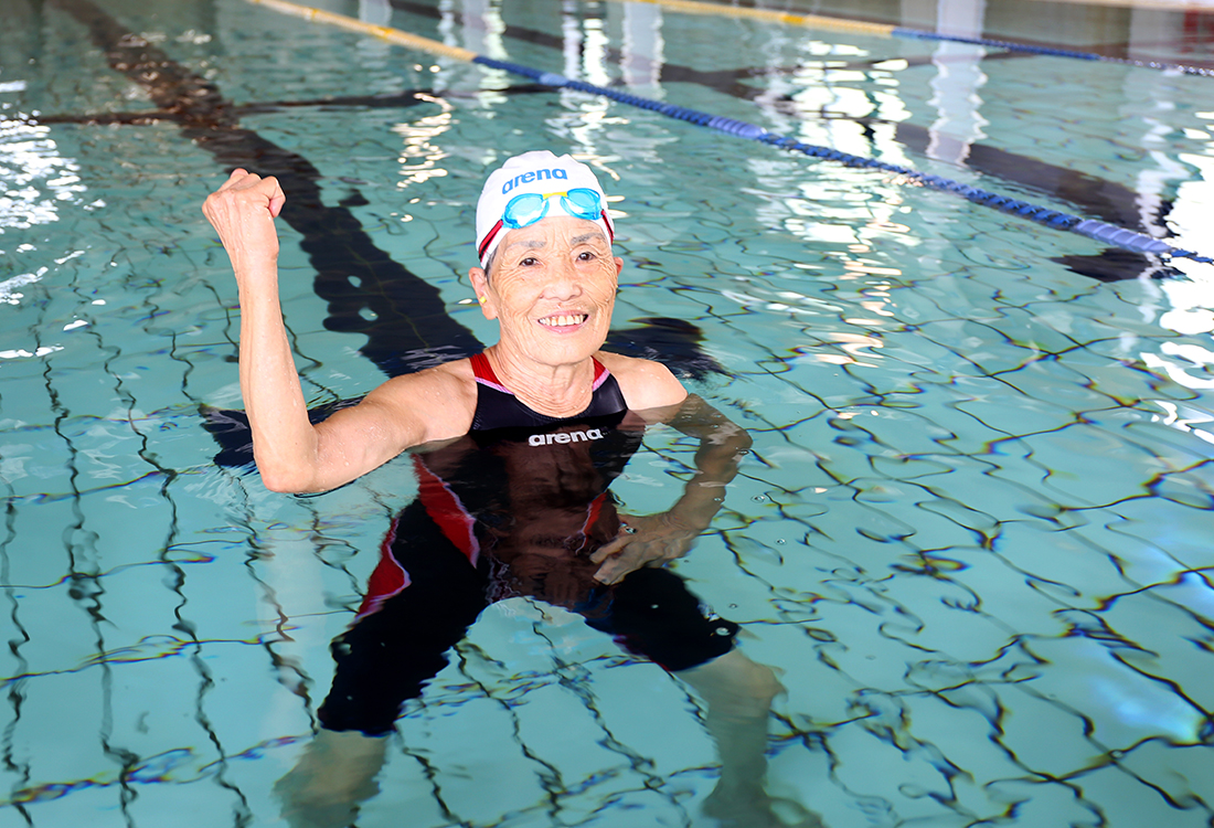 近年では、2023年に福岡市などで開催された「世界マスターズ水泳選手権九州大会」の75歳から79歳対象の女子400メートル自由形で、見事7位に入賞。昨年2月の「(一社)日本スイミングクラブ協会主催のJSCAマスターズ水泳通信記録会」では、80歳から84歳対象の自由形800メートルを15分22秒66で泳ぎ、大会新記録で優勝。今年2月の同大会では、自由形1500メートルで大会記録を5分以上縮める、29分53秒72で新記録を樹立。2年連続で優勝を果たした。中でも、今年挑戦した1500メートルは、25メートルプールを30往復する過酷な種目として知られている。