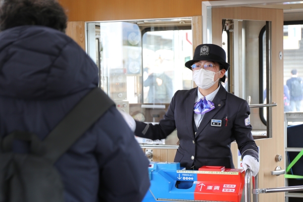集札の様子。田川さんはいつも、乗客の気持ちに寄り添った、丁寧な対応を心がけている。 |