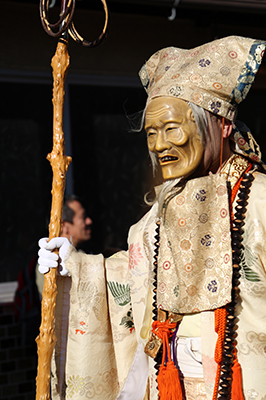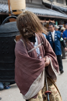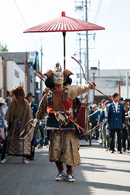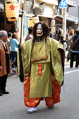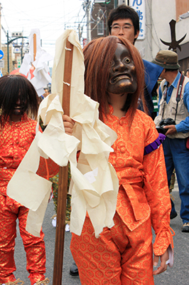 先導するのは、高さ約5mの大御幣。沿道を大きく動き回るひょろつき鬼や、子どもが扮する可愛い子鬼行列などが見物客を沸かせます。役行者が峰下りする様子と、鎮西八郎為朝が鬼を従える様子などが表わされています。