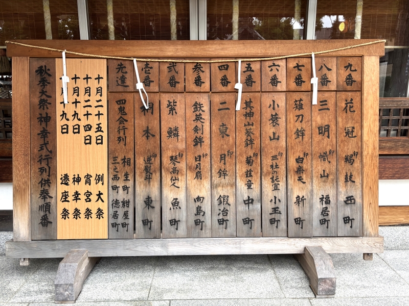 9つのだんじり町による、印(しるし)と絢爛豪華なだんじり。各町とも印を先頭にして、その後をだんじりが優雅な祭囃子を奏でながら進みます。神幸祭の巡行順位は、毎年9月9日の籤取り式で決まります。
