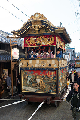 史料によると、今から約360年前の万治3年(1660)、城下の人々が藩主 藤堂高次に願状を出し、途切れていた祭の再興が許されたとあります。祭りは、ほぼ毎年、藩主が高覧したといい、その栄誉が発展への原動力になったのでしょう。行列は年々形を変えてゆき、庶民の生活が安定し町人文化も華やかであった元禄から文化・文政の時代には、神輿・鬼・だんじりが行列する現在の形がほぼ完成したとされています。絢爛豪華なだんじりの装飾などに当時の栄華が窺えます。