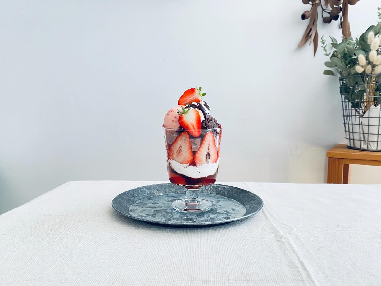 苺、苺ジェラート、チョコレートジェラート、チョコメレンゲクッキー、ベリーソース、苺ゼリー、ミルクチョコレートアイス、ココアクランブル、グラノーラ、生クリームを使用しています