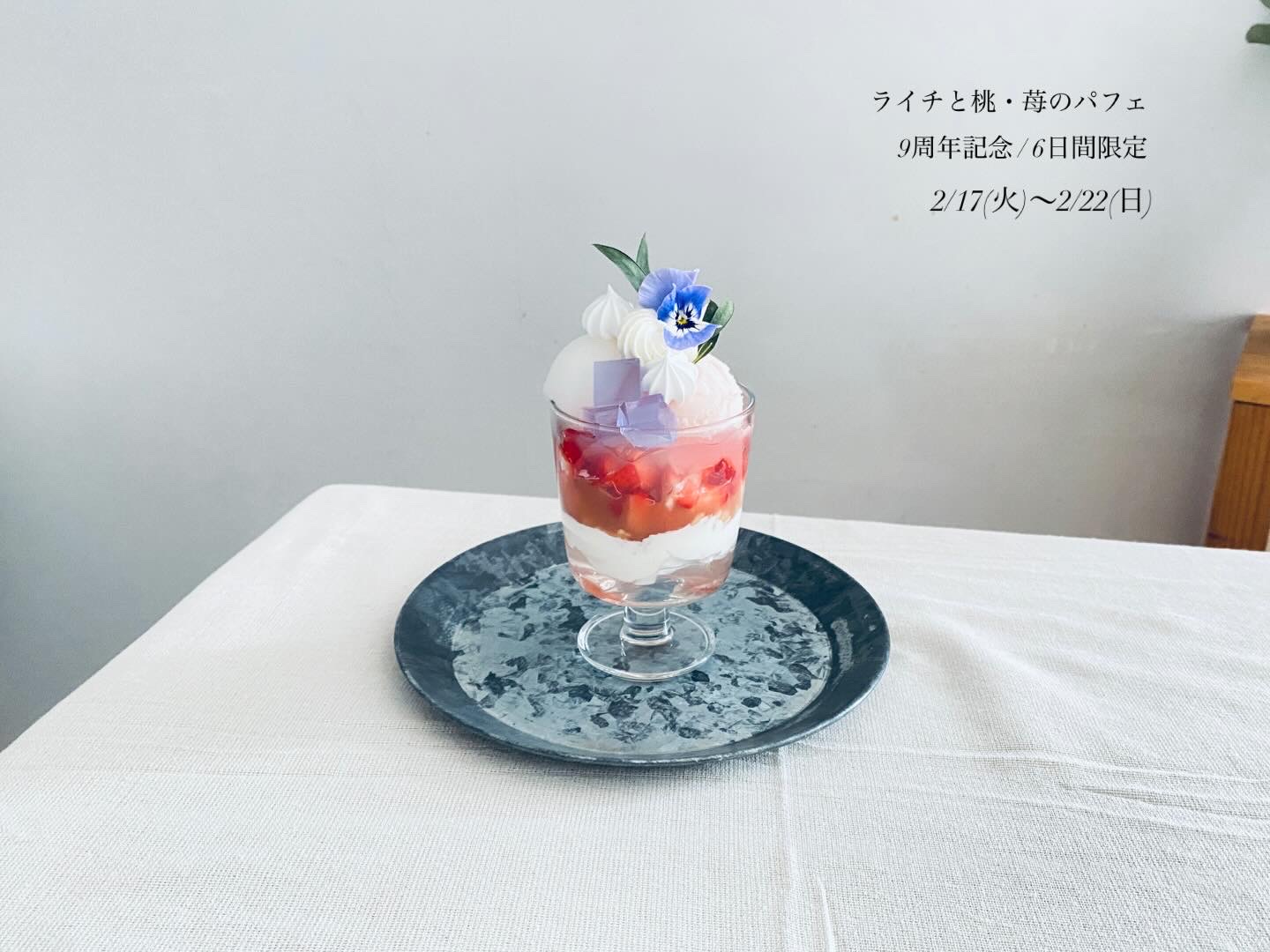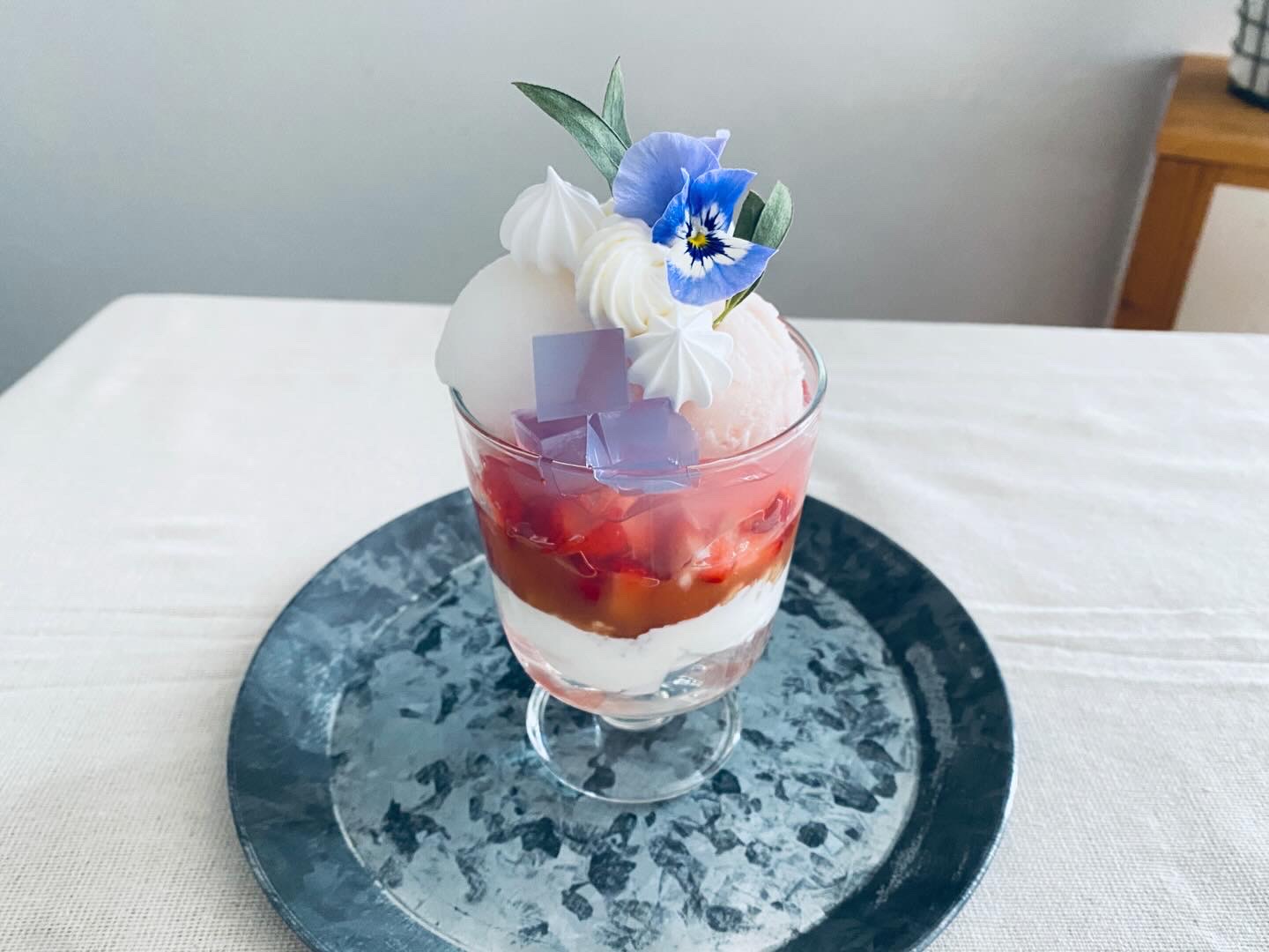 ライチジェラート、桃ソルベ、ライチとハーブの寒天、メレンゲクッキー、ビオラ、ライムとピーチリキュールのゼリー、苺、グァバジュレ、ココナッツジェラート、クランブル、グラノーラ、生クリーム、苺ソース、ライチゼリーを使用しています