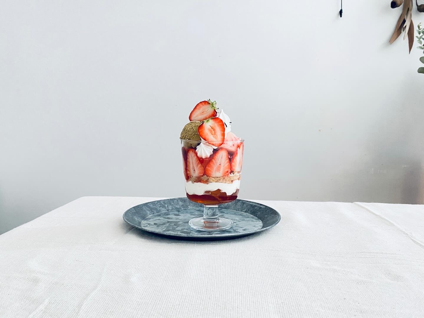 苺、苺ジェラート、和紅茶のミルクジェラート、紅茶のメレンゲクッキー、ベリーソース、苺ゼリー、アールグレイソース、紅茶クランブル、グラノーラ、生クリームを使用しています